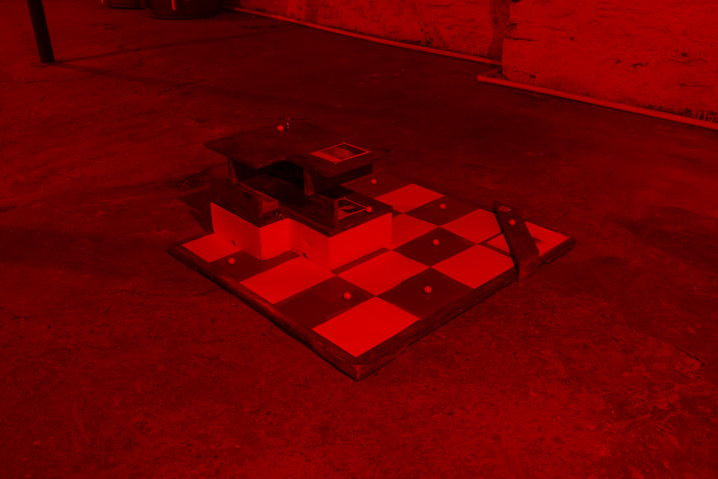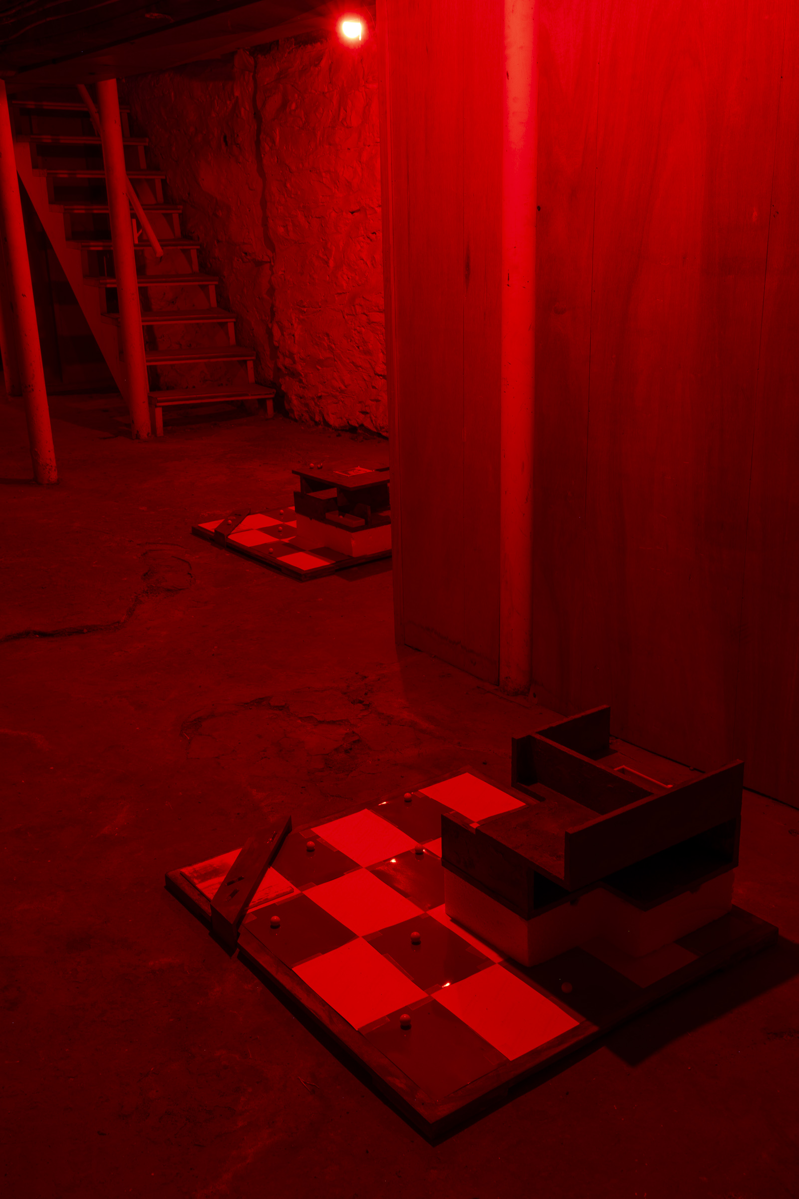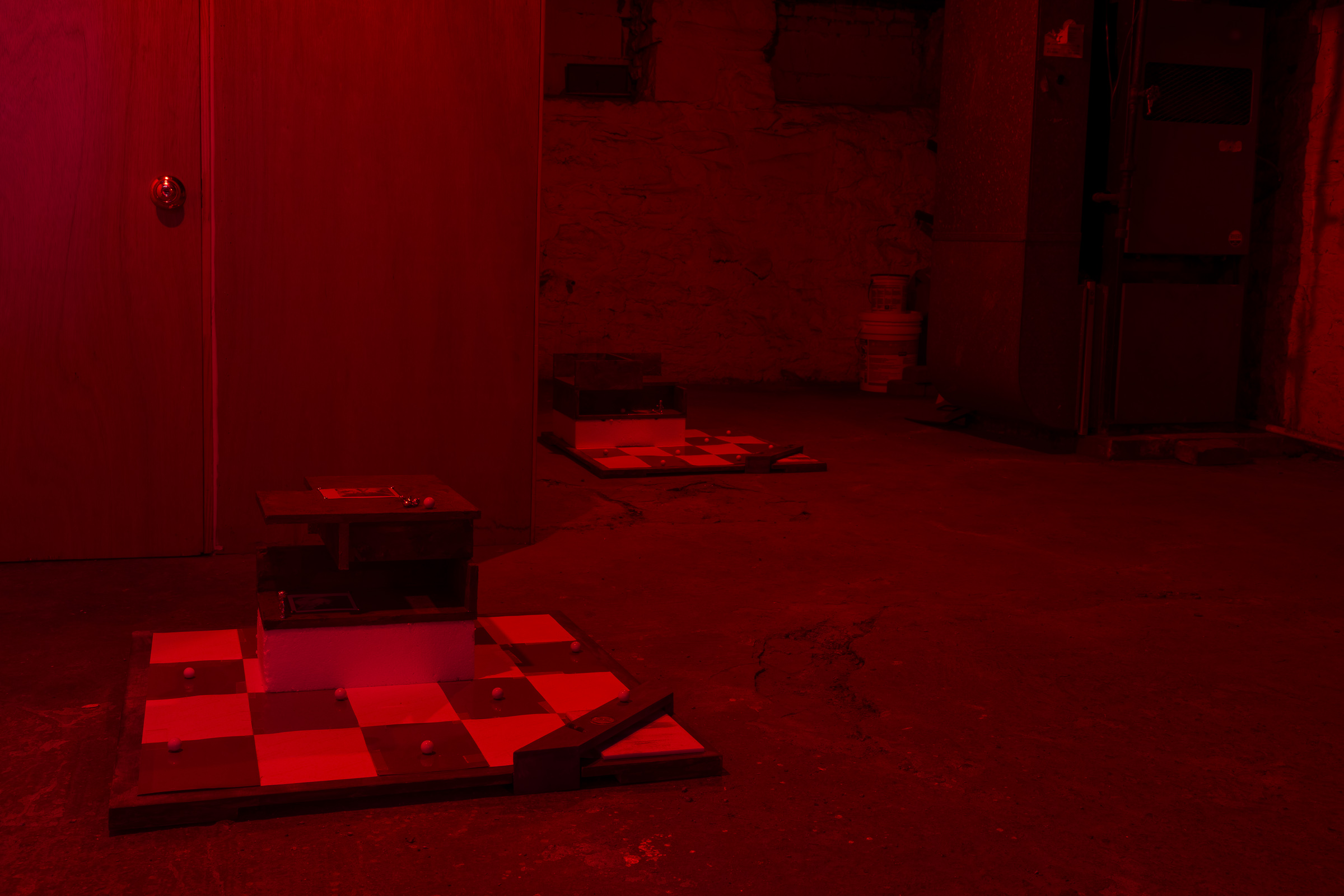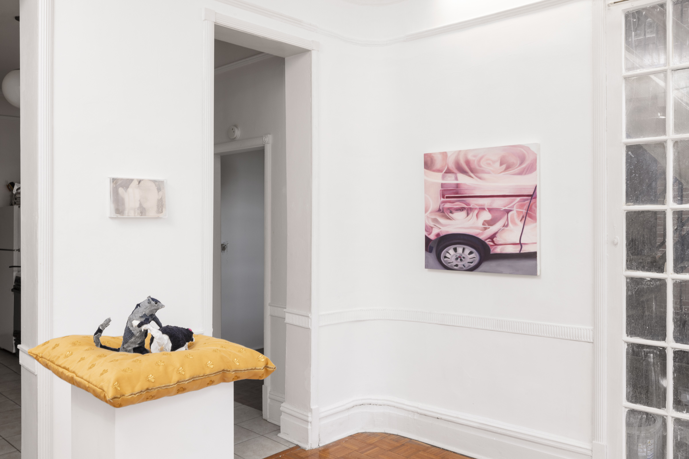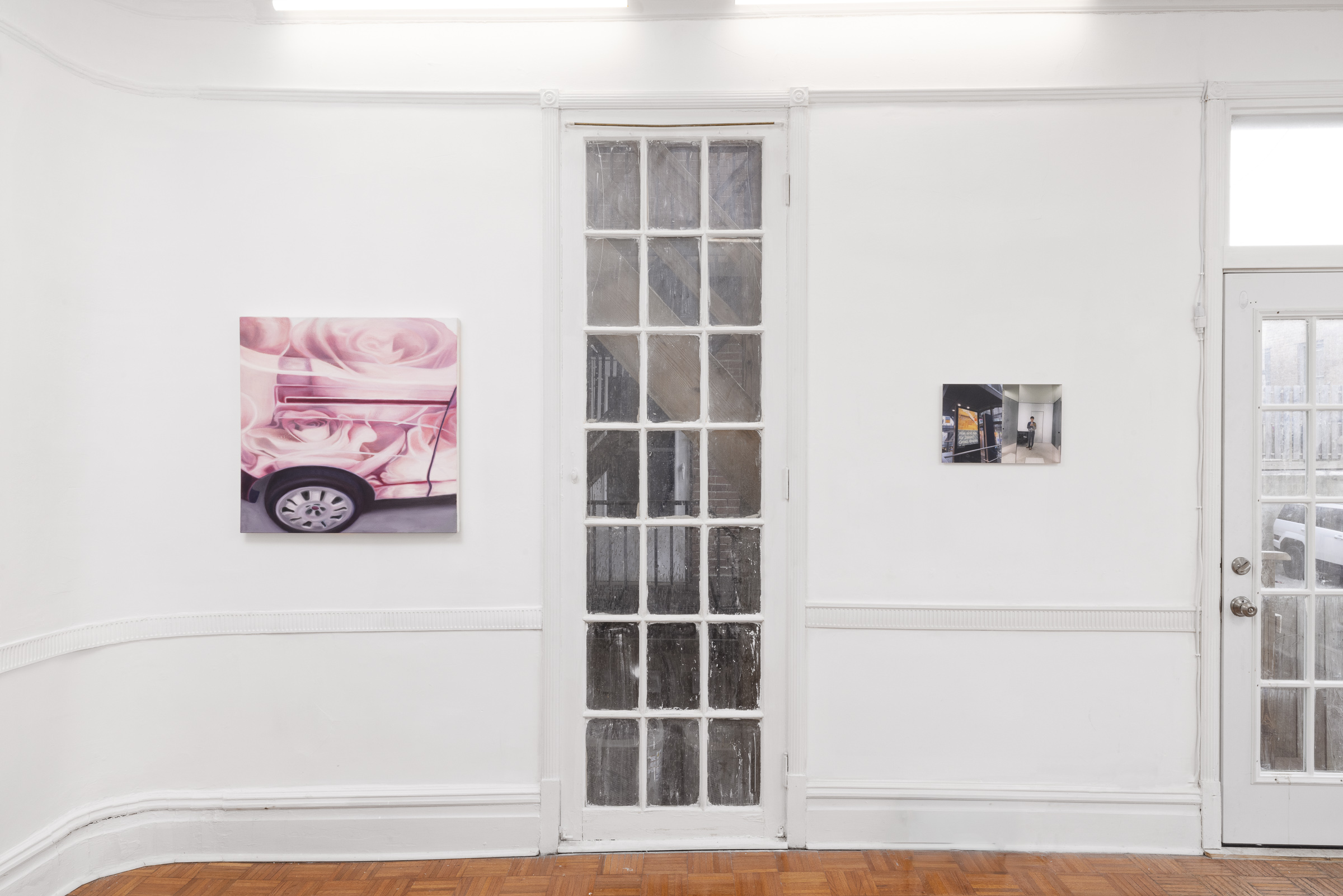 For Tasneem Sarkez, the car functions as a roving signboard for projecting individual identity and its legibility or illegibility, when drivers mark their possessions with decals and signage – and where roses are signifiers of Arab identity throughout her practice. Reproduced across commercial signage and packaging in Arab cultures, roses are often superimposed on objects to signal elegance and care, while the painting’s intentional sleekness interupted by scuff marks suggest meaning and hybrid cultural identity breaking down. Craig Jun Li’sbasement installation also reflects on image circulation as a means by which aesthetic forms produce distorted conceptions of “Eastern” or “Western.” Embodied in abstract architectural models of their childhood home from memory, their work is characterized by material degradation and modes of ethnographic display where images function as materially real as cultural mythologies inscribe belief systems into our private experiences of the world.
