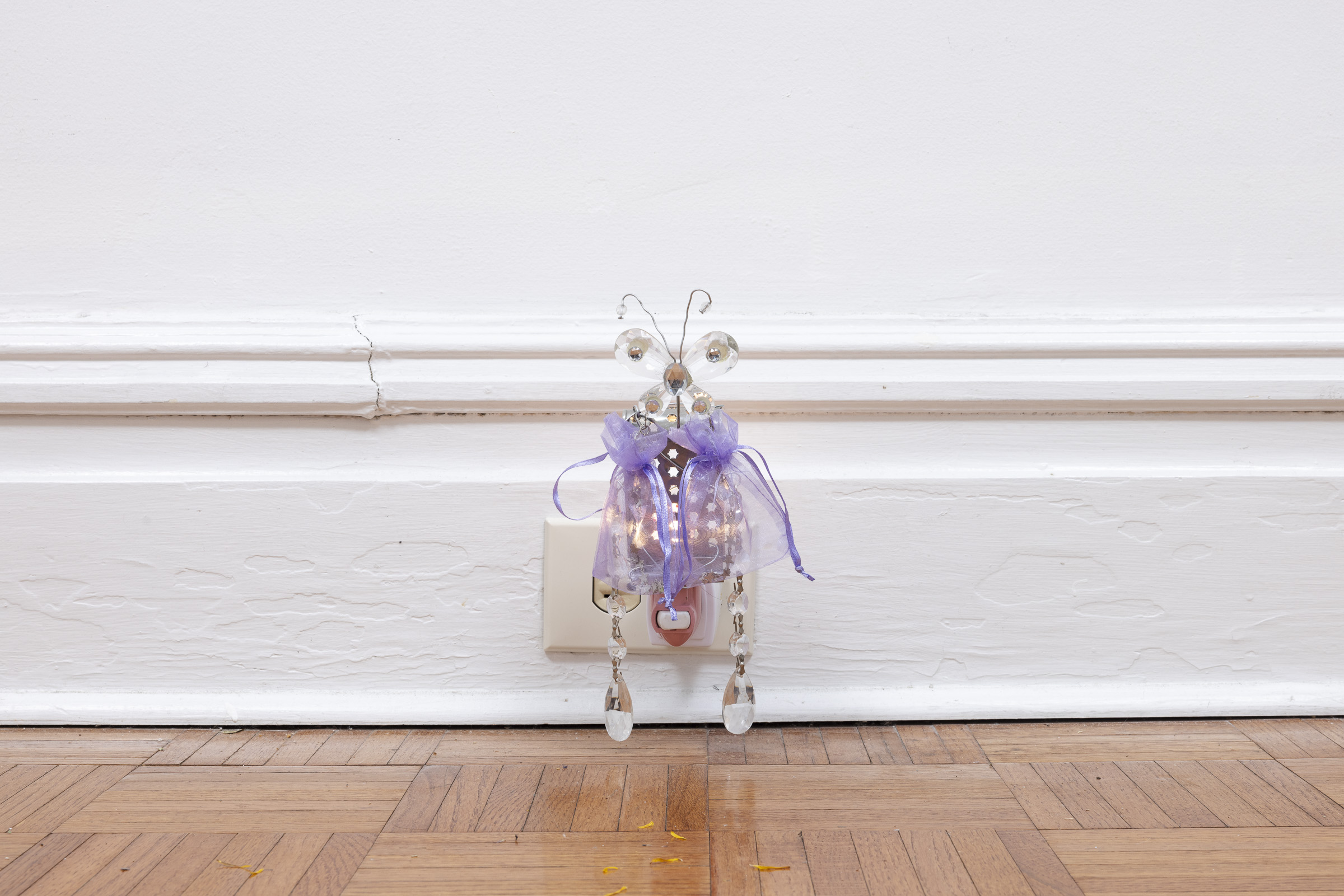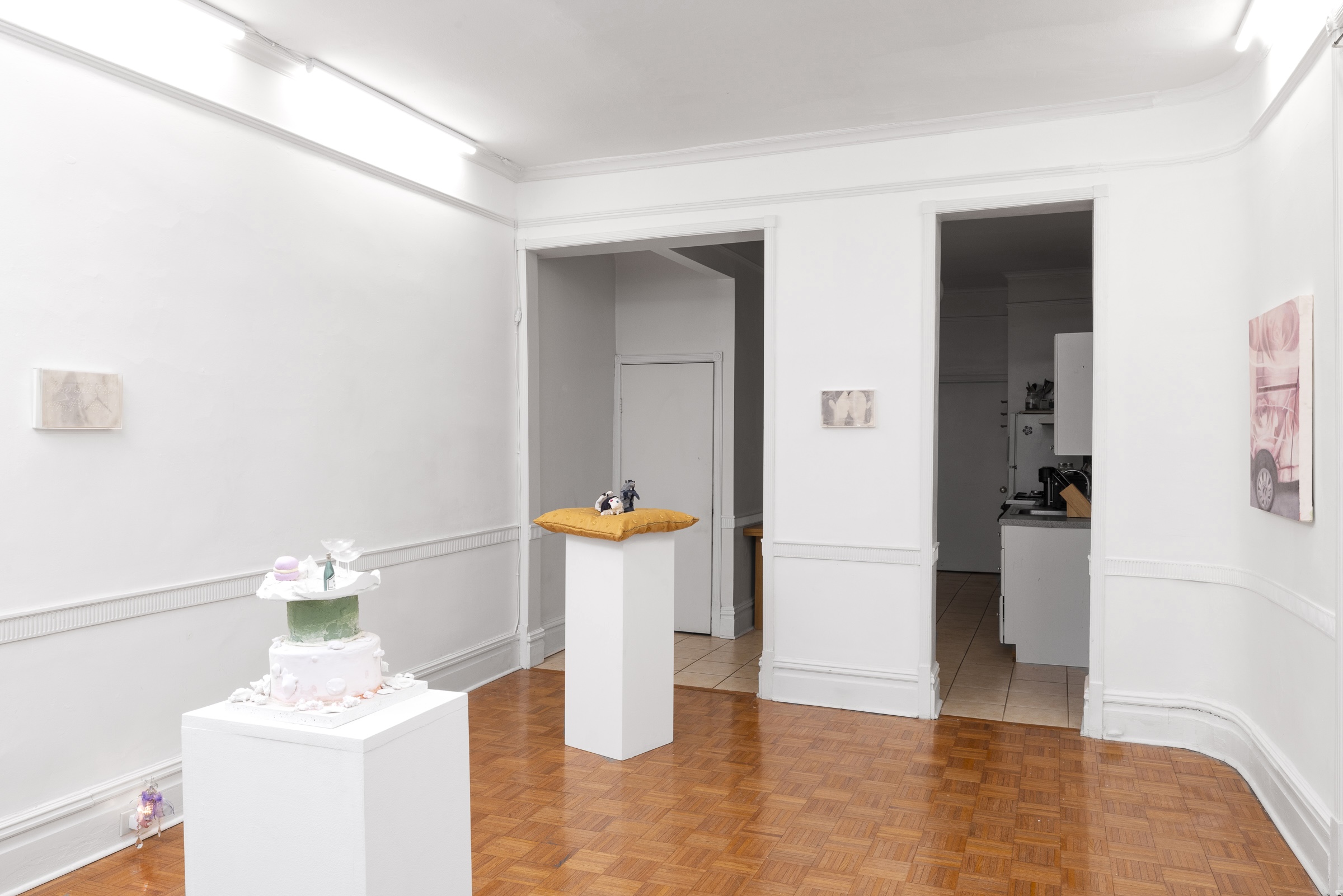 We know nothing about people who don’t cry takes its title from a 2016 pop-science article discussing ancient beliefs about why we cry, like expelling tears as love vapor, and more recent theories like, "crying [visibly] signals to yourself and other people that there’s some important problem that is at least temporarily beyond your ability to cope." This show brings together works that cope with reality through self-presentation and aesthetic registers of emotion that refuse to be entirely known, holding back tears as hyper-mediated branded tech and Instagram economics wiretap our brain synapses and capitalize our feelings for their own use. Throughout the exhibition, affective ambiguity cloaks despondence in blank stares, winks, and innocence in order to evade overdetermined identities and commodification of experience. In Sad to see you go, Gina Fischli presents a cake smeared with imitated icing in plaster, equally sweet and absurd and disheveled, while her slumped rodents resemble love-worn stuffed animals crouching in fugue state with pronounced futility. Tiziana La Mela’s nightlight sculptures decorated with gift-wrapping ribbons and butterfly adornments also traffic in the language of celebration while functioning as a source of haphazrd childlike comfort and tenusous efforts at self-soothing. This is not a “Let them eat cake” scenario, but a consideration of how to attenuate emotional pain when finding a total way out is impossible.
